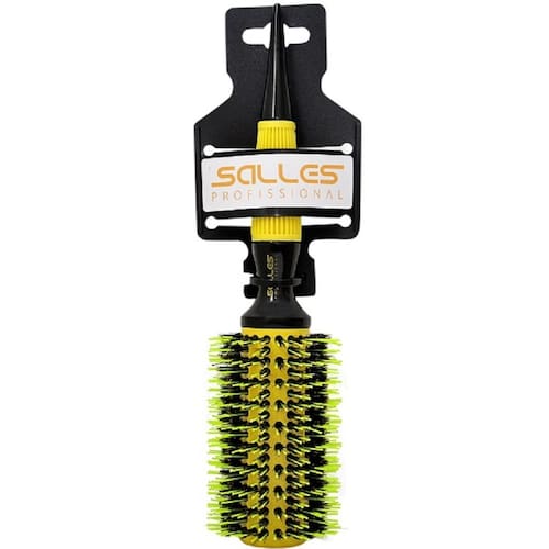 Escova profissional térmica, com base revestida em cerâmica amarela. Cuidado... O barato sai caro - Compre escovas de qualidade Cerdas mistas dupla altura, de javali e nylon em v, que proporciona maior tração na escovação. Ideal para cabelos mais crespos. Cabo em madeira laqueada preta, pontiagudo e anatômico, revestido em borracha, é ideal para alisar e modelar qualquer tamanho e tipo de cabelo. Especificações: A cerâmica ajuda a manter o calor do secador e agiliza a secagem. Para manter a durabilidade da escova, mantenha uma distância mínima de 5 cm do secador durante o uso. Material: cerâmica, madeira, cerdas de javali, nylon e borracha. Cor predominante: preto com amarelo. Itens incluso: 01 escova cerdas de javali salles profissional - N:04 - 34mm
