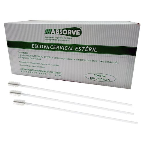 Escova Cervical DescartávelA escova cervical estéril é utilizada para coletar amostras da cérvix, para exames do esfregaço de papanicolau.Composição: polipropileno, nylon e aço inoxidável.- Produto de Uso Único- Estéril- Caixa com 100 Unidades- Dercartar após o uso- Modelo Tradicional- Esterilizado por óxido de etilenoRegistro ANVISA: 10379860193 Marca: Absorve