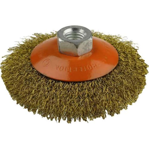 Escova Cônica Côncava Ondulada 100XM14 em Aço Latonado para Esmilhadeira Starfer Escova cônica com cerdas em aço latonado 100mm de diâmetro, altura de 19mm e com encaixe para de M14. O aço latonado, material apresenta flexibilidade e oferece um diferencial de qualidade agregando fino acabamento em superfícies de alumínio; -para tratamento de superfícies metálicas, retirada de ferrugem, retirada de pintura entre outros. -para uso em esmerilhadeiras. -limite máximo 12500rpm. Embalagem: caixa avulsa. Ref.: 05037311 Marca: Starfer Ean: 7891638039110