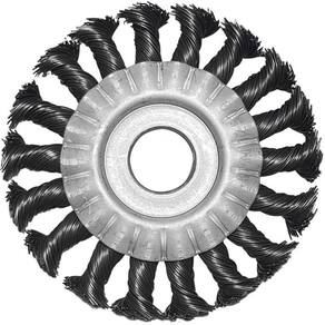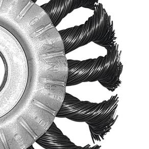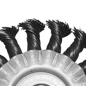 Escova circular trançada fabricada em aço carbono proporcionando resistência e eficiência, indicada para trabalhos pesados de limpeza ou remoção de carepas.