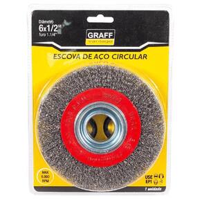 Marca: Graff Vantage A escova de aço circular é a mais comum para uso em moto esmeril e equipamentos elétricos. Ela existe em vários tamanhos, pra ser encaixada em furadeiras, esmerilhadeiras e lixadeiras, e serve tanto pra limpeza como pra remoção de ferrugens, vernizes e tintas. Marca: Graff