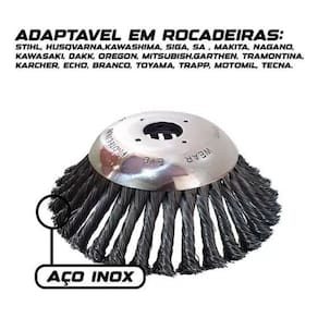 Escova De Aço Para Roçadeira Profissional Universal 1 Pol Diâmetro central: 25.4 mmEspessura: 100 mmPeso: 1 kgModelo detalhado: limpa calçadasCom bucha de redução: NãoÉ escova: SimTipo de discos e rebolos: De desbasteSuperfícies aptas: Grama,Pedras,chão,jardin,mato,passeios,ruasMaterial: Óxido de aluminio Marca: Nakasaki