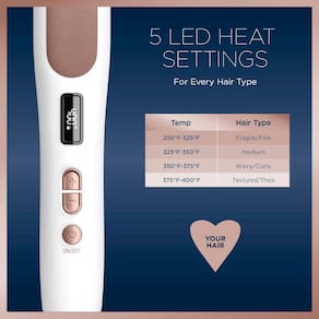 Controle de estilo: possui 5 configurações de aquecimento de LED para cada tipo de cabelo, atingindo uma alta temperatura de 390° F e recuperação uniforme de calor para um estilo consistente. Recurso de desligamento automático incluído. Dupla voltagem para uso em viagens internacionais.