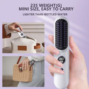 - ?Sem fio e portátil, fácil de transportar para viagens?: Esta escova alisadora portátil pesa apenas 235 g, é mais leve do que uma garrafa de água e você não ficará cansado se segurá-la por um longo tempo. O design mini e leve permite que você o use para alisar ao viajar ao ar livre, em viagens de negócios, em qualquer lugar e a qualquer momento. cabelo.