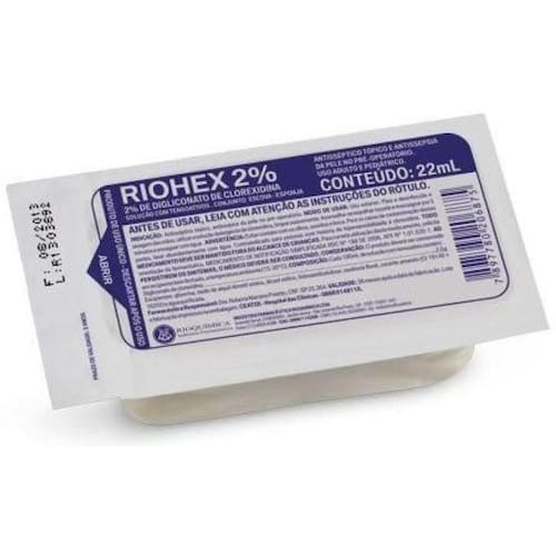 Riohex 2% é uma solução de Digliconato de Clorexidina 2% com tensoativos, indicada como antisséptico tópico, antissepsia pré-operatória das mãos e braços. CONTEÚDO: 22 mL escova / esponja - Embebida em solução degermante com 22ml de diglIconato de clorexidina 2% e tensoativo. - Dupla Face. As cores apresentadas no site são meramente ilustrativas e podem ou não corresponder com exatidão à tonalidade aplicada. Para mais informações sobre manuseio e cuidados quanto ao uso do produto, consulte o Manual do Usuário. Imagem meramente ilustrativa e a descrição do produto é de responsabilidade do fabricante. Ean: 7897780206875