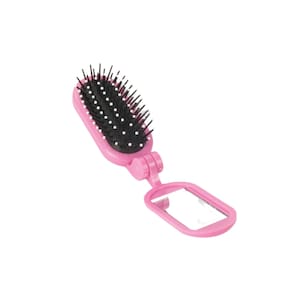 A escova dobrável com espelho é ótima para pentear e desembaraçar cabelos lisos e ondulados. Massageia o couro cabeludo, pois sua almofada se molda ao mesmo. Possui cabo em resina plástica e espelho. A escova se fecha e pode ser transportada facilmente em bolsas ou necessaires.