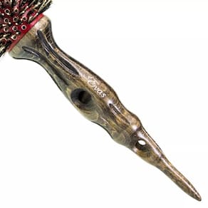 Possui cabo de madeira para aderir ao formato da mão e deixar a escova mais firme no processo de modelagem, alisamento e escovação dos cabelos. O cabo de madeira com a parte superior em cerâmica na cor vermelha.