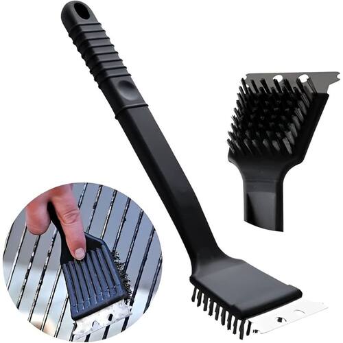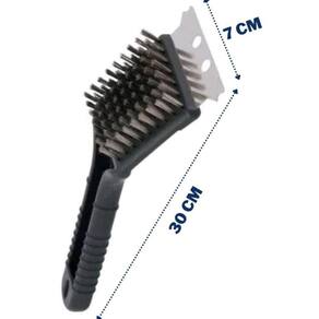 A limpa grelha de churrasqueira com espátula, cerdas de aço e cabo de polipropileno é a melhor pedida para te auxiliar na limpeza pós churrasco. Suas cerdas e espátula em aço inox realizam perfeitamente o trabalho de remover resíduos sem muito esforço. Mantenha sua churrasqueira, espetos e grelhas sempre limpos e prontos para o uso!Especificações:- Medidas: 30cm (comprimento) x 7cm (largura) Composição:- Material da escova e espátula: Aço Inox- Material do cabo: Plástico Polipropileno- Cor: Preto