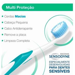 Escova de dente macia multi proteção sensodyne kit x5 Escova macia multi proteção se Cerdas macias. Especialmente desenvolvida para limpeza cuidadosa e suave dos dentes e gengivas. Cabeça oval. Desenvolvida para se adaptar as áreas delicadas dos seus dentes e gengivas fornecendo uma limpeza completa da sua boca. Cabeça pequena, limpeza efetiva até mesmo nas áreas de difícil alcance. Cabo anti derrapante, proporciona uma pegada segura e permite um controle melhor da escovação.