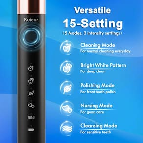 Escova de dentes elétrica para adultos e crianças -?Escova de dentes elétrica para crianças e adultos?Nossa escova de dentes elétrica premium foi projetada com ergonomia excepcional para fornecer a melhor experiência de escovação para usuários de todas as idades. Projetada com tecnologia avançada e uma abordagem cuidadosa e centrada no usuário, essa escova de dentes se encaixa confortavelmente na mão, permitindo uma fácil manobrabilidade ao redor da boca. -?Design versátil de 15 modos?Esta escova de dentes elétrica oferece aos usuários uma experiência de limpeza ainda mais versátil e personalizável. Os 5 modos principais, cada um com 3 configurações de intensidade, permitem que os usuários atendam com precisão às suas necessidades específicas de saúde bucal, seja limpeza completa, clareamento, cuidado gengival ou escovação suave com foco na sensibilidade. Esse nível de personalização aprimora ainda mais a capacidade do produto de oferecer resultados de limpeza excepcionais, adaptados às necessidades individuais do usuário. -?Longevidade e conveniência excepcionais?Oferecendo 30 meses de uso com 10 cabeças de escova de reposição (cada uma com duração de 3 meses), este conjunto abrangente de acessórios também inclui 1 estojo de viagem, 1 cabo de carregamento USB, 1 manual do usuário e 1 suporte para escova de dentes. Isso garante valor e conveniência excepcionais a longo prazo, mantendo os usuários bem equipados para uso prolongado sem a necessidade de comprar novas cabeças de escova com frequência. -?Remoção avançada de placa?Alimentada por um eixo de metal, a escova de dentes elétrica Kuicur utiliza a mais recente tecnologia de vibração sônica para oferecer um desempenho de limpeza excepcional. Atingindo até 42.000 vibrações por minuto, esse movimento sônico de alta frequência está muito além das capacidades das escovas de dente elétricas tradicionais. As vibrações sônicas acionadas por metal desalojam efetivamente a placa bacteriana e os restos de comida, proporcionando uma limpeza profunda e completa. -?CRONÔMETRO INTELIGENTE DE NOTIFICAÇÃO VIBRATÓRIA?Controle de cronômetro inteligente integrado, intervalo de 30 segundos lembrando você de passar para o próximo quadrante da boca e totalmente em 2 minutos (4 quadrantes), o que é altamente recomendado por dentistas profissionais, como forma correta de escovação.
