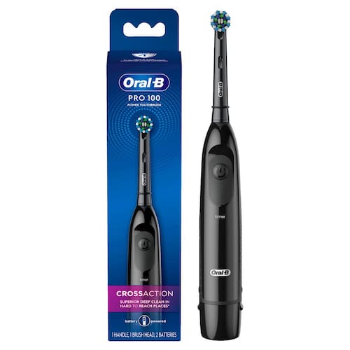 Oral-B Pro 100 CrossAction, escova de dentes elétrica alimentada por bateria, preta - A escova de dentes alimentada por bateria Oral-B Pro-Health atinge a profundidade para uma remoção superior da placa bacteriana e gengivas mais saudáveis do que uma escova de dentes manual comum - a cabeça da escova Cross Action possui uma cabeça de escova redonda para uma limpeza dente a dente. - Desempenho consistente da bateria. 2 pilhas AA incluídas - Compatível com outras cabeças de escova Oral-B: CrossAction, Sensitive Gum Care, FlossAction, 3D White - Oral-B é a marca #1 de escovas de dentes recomendada por dentistas em todo o mundo - As baterias precisarão ser substituídas em 6 a 9 meses.