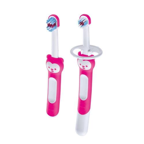 Escova De Dentes Mam 5+ Learn Brush 8308 Rosa Menina Dupla A Learn To Brush da MAM possui design que assegura dentes saudáveis e faz da escovação uma agradável experiência Possui cerdas extra macias e arredondadas que removem as placas e bactérias, cabo curto e compacto para as pequenas mãos dos bebês, material anti-deslizante e formato ergonômico para uma pega mais firme e higienizador de língua delicadamente texturizado