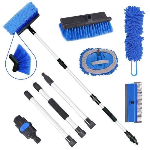 O kit de lavagem de carros cobre tudo o que é necessário para limpar carros de forma eficiente e manter carros, trailers, SUV e caminhões brilhantes. Pode limpar qualquer superfície sem arranhões, mesmo em ângulos estranhos e locais difíceis de alcançar. Você receberá uma escova de lavagem de carro de 182 cm com cabo longo, uma escova de cerdas macias de 5 lados. Esta escova de lavagem de carro com uma alça de extensão pode ser usada de inúmeras maneiras. Multifuncional e prático, perfeito para limpar ou lavar painéis solares, tapume de casa, carros, caminhões, SUVs, trailers, barcos, calçadas, decks, pisos, pátios, banheiros, chuveiros, remoção de neve e muito mais! - Escova de lavagem de carro resistente de 137 cm com alça longa: a escova de lavagem de carro inclui 3 postes de alumínio com comprimento ajustável de até 1,4 m. Os postes de alumínio resistentes não são apenas leves, mas também evitam esticar, dobrar ou torcer. O esfregão de lavagem de carro antiderrapante e fácil de segurar permitirá que você economize mais esforço. As hastes de alumínio estão firmemente conectadas, então não há necessidade de se preocupar com vazamento de água ou pulverização. Tanto a cabeça do esfregão multifuncional quanto a cabeça do esfregão de escova de chenille podem ser montadas no mastro - Conexão de escova de imersão e interruptor conveniente: esta escova de limpeza externa de carro vem com um adaptador com um interruptor de água liga/desliga que pode ser anexado a uma mangueira de jardim. A água é continuamente pulverizada através das cerdas. Pressione quando não for necessário água - Cabeça de escova de lavagem multifuncional 2 em 1: a esponja de nylon de 20 cm dá a você poder de limpeza profissional. O rodo de janela de carro bem projetado é feito de borracha durável que é difícil de quebrar. A lâmina de borracha macia move a espuma e a água facilmente, definitivamente sem manchas. Uma esponja de rede de nylon oferece uma limpeza completa - Escova de pneu de roda de carro: a escova de roda/pneu possui cerdas macias e densas para limpeza profunda, e a aderência confortável garante uma limpeza fácil e eficaz. Com ele, você pode limpar facilmente a sujeira em todas as fendas, como pneus, rodas, para-choques e aros, tornando a limpeza do carro mais acessível - Cabeças de esfregão de escova de carro de material de chenille de alta qualidade: a cabeça do esfregão de escova de carro de material chenille de alta qualidade produz espuma rica, perfeita para limpar para-brisas de carros, janelas domésticas, etc. Também pode ser utilizado como luva de lavagem de carro, esponja ou pano - Aplicação da escova de limpeza de carro: Esta escova de lavagem de carro com uma alça de extensão pode ser usada de inúmeras maneiras. Multifuncional e prático, é perfeito para limpar ou lavar painéis solares, tapume de casa, carros, caminhões, SUV, trailers, barcos, calçadas, decks, pisos, pátios, banheiros, chuveiros, remoção de neve e muito mais
