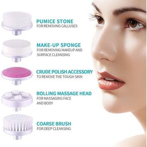 Inclui 6 acessórios: pincel macio, disco de massagem com rolo, esponja de maquiagem, esponja de látex macia e esponja extra.
