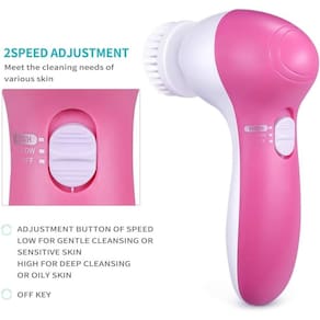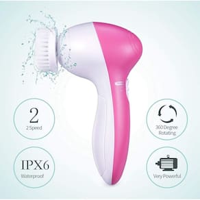 Escova facial giratória com motor de 2 velocidades: baixa para limpeza suave, alta para esfoliação profunda.