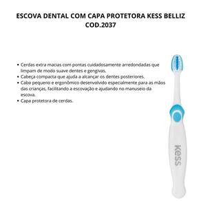 Escova Dental Kess Steps Com Capa ProtetoraCaracterísticasA linha Kess Steps foi desenvolvida para acompanhar e motivar as crianças no processo de auto-higienização bucal. Para cada estágio da infância, um Step diferente! Todas as escovas da linha Kess Steps possuem:Cerdas extra macias com pontas cuidadosamente arredondadas que limpam de modo suave dentes e gengivas.Cabeça compacta que ajuda a alcançar os dentes posteriores.Cabo pequeno e ergonômico desenvolvido especialmente para as mãos das crianças, facilitando a escovação e ajudando no manuseio da escova.Capa protetora de cerdas..DiferencialDesenvolvido especialmente para as mãos das crianças, ajudando no manuseio da escova e facilitando a escovação, limpando de modo suave dentes e gengivas. Além de terem formatos e desenhos lúdicos para incentivar esse hábito importante!.Modo de uso1 – Para abrir a capa protetora, utilize o apoio na parte de baixo e deslize para o lado. Após aberto, retire de dentro do bichinho as duas ventosas.2 – Encaixe as ventosas na parte de trás onde há duas aberturas. Coloque pela parte maior da abertura e deslize para a parte menor a fim de travá-la.Fixe a capa protetora em uma superfície lisa e certifique-se de que está bem presa.3 – Com a capa protetora aberta, coloque a escova dental e pressione ao fundo para que se feche.4 – Para abrir basta puxar a escova para frente..Cerdas: Extra macias