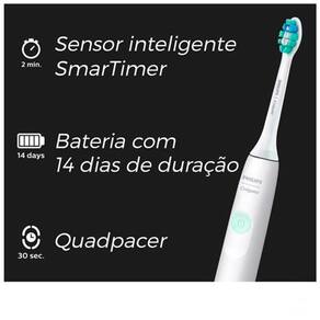 A escova de dentes elétrica Philips Colgate SonicPro 10 é uma ótima opção para quem deseja fazer a transição entre uma escova manual e a elétrica. Ela remove 200% mais placa* e durante os primeiros dias de uso, aumenta gradativamente a intensidade de movimentos. A escova de dente sônica é recarregável, possui bateria de longa duração e cabo ergonômico à prova d'água, possibilitando o uso no banho. *vs. uma escova de dentes manual. Remove 200% mais placa* *vs escova de dentes manual Escova de dente sônica: produz 31,000 movimentos por minuto, 2 minutos de escovação equivalem a 1 mês de movimentos com escova manual. Temporizador Inteligente de 2 minutos para que você escove pelo tempo recomendado por dentistas. Vibrações de 4 tempos, pausas rápidas a cada 30 segundos para que você escove as 4 regiões da boca de forma consistente, incentivando uma limpeza completa. Á prova dágua IPX7. Bateria de longa duração (até 14 dias). Contém 1 escova de dente elétrica recarregável e carregador USB. Características Tipo: Adulto Cabo Anatômico Pescoço Substituível Velocidade (movimentos por minuto): 31.000 Temporizador Indicador de Carga Recarregável Especificações Técnicas Modelo: SONICPRO 10 Alimentação: Carregador Bivolt Cor: Branco EAN: 8710103985365 Garantia: 24 meses Dimensões Dimensões do produto com embalagem (AxLxP): 220x109x63 mm Peso do produto sem embalagem: 0,17 kg Peso do produto com embalagem: 0,25 kg Itens Inclusos 01 Escova 01 Carregador com Cabo USB