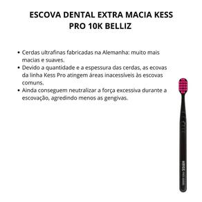 Escova dental com cerdas feitas de um material diferenciado, importado da Alemanha, que é tão fino quanto um fio de cabelo! Por isso, são ainda mais macias que as tradicionais, que tem cerdas de nylon.E o resultado disso é LIMPEZA EFICIENTE e CONFORTÁVEL!Devido a quantidade e a espessura das cerdas, as escovas da linha Kess Pro atingem áreas inacessíveis às escovas comuns. As cerdas especiais ainda conseguem neutralizar a força excessiva durante a escovação, agredindo menos as gengivas.