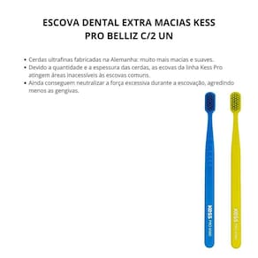 Pack de duas escovas dentais com cerdas feitas de um material diferenciado, importado da Alemanha, que é tão fino quanto um fio de cabelo! Por isso, são ainda mais macias que as tradicionais, que tem cerdas de nylon.E o resultado disso é LIMPEZA EFICIENTE e CONFORTÁVEL!Devido a quantidade e a espessura das cerdas, as escovas da linha Kess Pro atingem áreas inacessíveis às escovas comuns. As cerdas especiais ainda conseguem neutralizar a força excessiva durante a escovação, agredindo menos as gengivas.