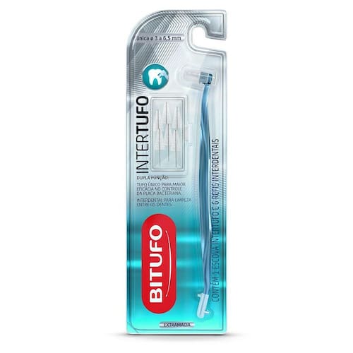 Bitufo Intertufo Cônica é a escova dental para uma higiene bucal avançada. De um lado, a escova possui um tufo único que limpa dente a dente, para um maior controle da placa bacteriana. Do outro lado fica a escova interdental, que atua nos espaços onde a escova convencional e o fio dental não alcançam. Marca: Não Informado