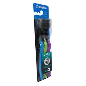 - Pacote com 3 unidades. - Proporciona limpeza profunda. - Cerdas com pontas ultra finas com carbono. - Cabeça com dupla flexibilidade, que absorve impacto na escovação. - Protege o esmalte dos dentes e gengivas sensíveis. - Cabo emborrachado. - Cerdas macias. Marca: Jade Pro