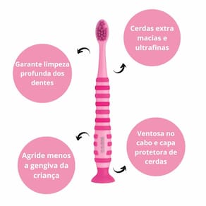 Maior número de cerdas* que garantem limpeza profunda dos dentes. Cerdas extra macias e ultrafinas feitas de um material especial que oferecem mais conforto na escovação, agredindo menos a gengiva da criança e oferecendo maior conforto na escovação. Cabeça compacta que ajuda a alcançar os dentes posteriores. Ventosa no cabo. Capa protetora de cerdas.