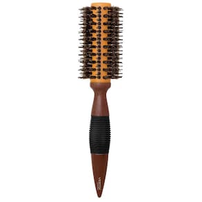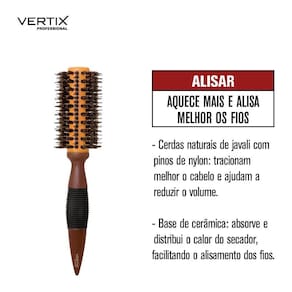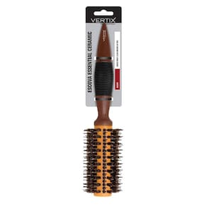 Escova redonda de madeira com base de cerâmica e cerdas naturais de javali intercaladas com pinos de nylon. A base de cerâmica retém o calor do secador por mais tempo, além de distribui-lo mais uniformemente. As cerdas e pinos proporcionam a tração ideal para cabelos mais volumosos e difíceis de penetrar.