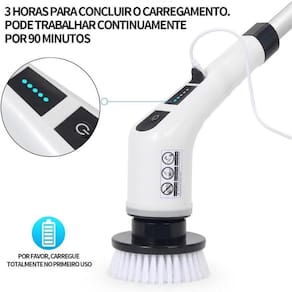 Escova de limpeza elétrica recarregável multifuncional com 9 acessórios, ideal para limpeza doméstica e de carros. Possui tubo extensor para alcançar locais altos e cabeça especial para cantos e torneiras. Feita em ABS e nylon, com bateria de 2500mAh que oferece 90 minutos de uso após 3 horas de carregamento.Vendido e entregue por Olist Store