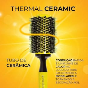 Escova Marco Boni Thermal Ceramic Premium 60mm 7967t - Escova Pro Thermal Ceramic Premium 60mm Ref 7967T - Cerdas dupla altura: cerdas de javali e nylon que proporciona maior tração aos fios; - Tufagem reta: desliza com mais facilidade nos cabelos; - Cabo antideslizante; - Cabo separador de mechas; - Tamanho: 60mm de diâmetro; - Thermal Ceramic: corpo revestido de cerâmica; ajuda a manter a temperatura do secador de modo uniforme e prolongado; agiliza a secagem. - Dicas de uso: Envolva uma mecha nas cerdas da Escova Pro Tools, e utilize o jato de ar quente soprando de cima para baixo, evitando o efeito arrepiado.Comece o movimento de escovação pela raiz, passe para a metade do comprimento da mecha até as pontas. Para modelar e selar os fios, sem causar danos aos cabelos, utilize a face lisa de alumínio, que aquecerá rapidamente, deixando sua escovação perfeita. Repita esse procedimento em todas as mechas. - Dicas de conservação: Para conservar sua escova, o ideal é manter uma distância mínima de 5 a 7 centímetros do secador.