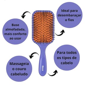 A escova Raquete Premium é ideal para desembaraçar o fios. Ela possui base almofadada que da mais conforto ao usar e massageia o couro cabeludo. Faz aquela massagem no couro cabeludo. Para todos os tipos de cabelo.