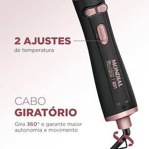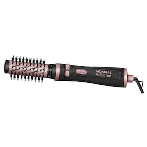 ESCOVA ROTATIVA MOTORIZADA: A escova Mondial une o movimento rotativo, parecido com a escovação, com o calor do secador. E tem duplo sentido de rotação: gira 360 nos dois sentidos, permitindo modelar o cabelo para dentro ou para fora.