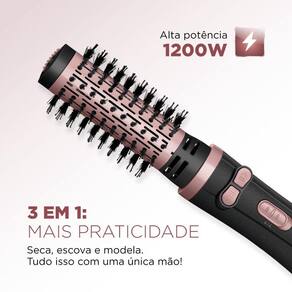 3 EM 1: Com um único produto, você seca, alisa e modela. Tudo isso de forma prática: utilize uma única mão e dê adeus ao malabarismo de usar escova em uma mão e secador na outra. A escova alisa cabelos secos, úmidos e até molhados, além de finalizar perfeitamente pontas e franjas.