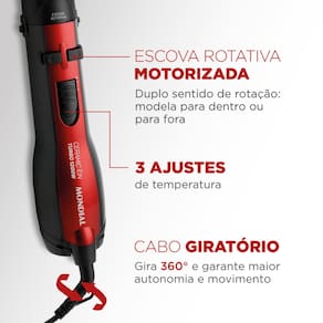ESCOVA ROTATIVA MOTORIZADA: A escova Mondial une o movimento rotativo, parecido com a escovação, com o calor do secador. E tem duplo sentido de rotação: gira 360° nos dois sentidos, permitindo modelar o cabelo para dentro ou para fora.