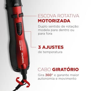 - ESCOVA ROTATIVA MOTORIZADA: A escova Mondial une o movimento rotativo, parecido com a escovação, com o calor do secador. E tem duplo sentido de rotação: gira 360° nos dois sentidos, permitindo modelar o cabelo para dentro ou para fora.