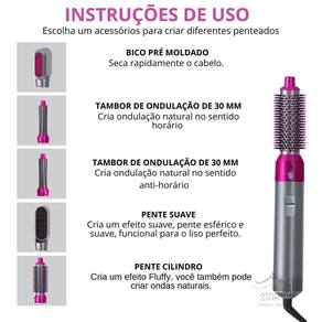 ------------------ conteúdo ------------------ 1x suporte de escova. 1x bico secador de cabelo. 1x bico de ondulação anti-horário. 1x bico de ondulação sentido-horário. 1x bico pente alisador. 1x bico pente cilindro