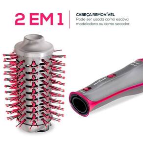 Características Adicionais: Seca, alisa, modela e dá volume Diâmetro de 54mm, pode ser usada como secador Duas cerdas duras por furo para modelagem mais rápida e durabilidade 2 temperaturas, 2 velocidades e jato de ar frio para finalizar penteados Protege os fios do calor, evita ressecamento e atrito, e proporciona brilho Com alça, 180cm de comprimento, para maior liberdade de movimento e fácil armazenamento Produz íons que fecham as cutículas dos fios, reduzindo o frizz e resultando em cabelos mais macios e brilhosos
