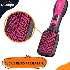 Características: • 136 Cerdas Ultra Flexíveis com Pontas de Epóxi: Deslizam suavemente pelos fios, mesmo úmidos, sem puxar ou quebrar. Garantem desembaraço confortável e eficaz. • Tecnologia de Íons Negativos: Neutraliza a eletricidade estática e reduz o frizz, deixando os cabelos mais brilhantes, macios e com aparência saudável. • Base Acolchoada de Silicone: Suaviza o contato com os fios, melhora o controle durante o uso e proporciona um acabamento mais brilhante e profissional. • Design ergonômico com acessórios removíveis: Leve, prático e fácil de manusear. Seus componentes removíveis facilitam a higienização, o armazenamento e o transporte, sendo perfeita para viagens ou para manter a bancada organizada.