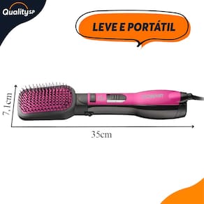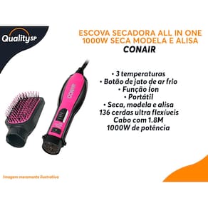 Ficha Técnica: • Marca: Conair • Modelo: Escova Secadora 3 em 1 • Tipo: Escova secadora com corpo removível • Voltagem: 220V • Potência: 1000W • Tecnologia de Íons: Sim (íons negativos para eliminar frizz) - E reduzem a eletricidade estática, proporcionando cabelos mais macios e brilhantes • Cerdas: 136 cerdas ultra flexíveis com pontas de epóxi • Base da escova: Acolchoada com silicone • Funções: Secar, alisar, desembaraçar e modelar • Comprimento do Cabo: 1,8 MT •Temperaturas: 3 níveis de ajuste: fria, baixa ou alta • Cor: Rosa e Preto • Acessórios removíveis: Sim