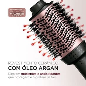 1 produto, 3 funções: seca, alisa e modela! Com a Escova Secadora Black Rose Argan, você deixa os cabelos lindos usando apenas uma mão para modelar. ?? muita praticidade! Além disso, o revestimento com ??leo de Argan cuida da saúde dos fios, deixando as mechas protegidas e hidratadas.