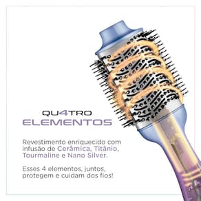 A Escova Secadora da Linha by Juliette Qu4tro Elementos traz um revestimento especial enriquecido com infusão de Cerâmica, Titânio, Tourmaline e Nano Silver. Esses 4 elementos, juntos, protegem seus fios e garantem uma aparência mais saudável aos cabelos, com brilho intenso, maciez e sem frizz.