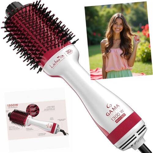 - **Modelo**: Escova Secadora Lichia 3D - **Cord do Produto**: Vermelho lichia e Branco mármore - **Tipo de Escova**: Secadora - **Formato da Escova**: Oval - **Tecnologias**: Essential Oils, 3D Therapy - **Temperaturas**: 3 Temperaturas - **Velocidade**: 2 Velocidades - **Emissão de Íon**: Sim - **Voltagem**: Bivolt - **Potência**: 1300W - **Material das Cerdas**: Cerdas Duplas em Nylon - **Cabo Giratório**: Sim - **Comprimento do Cabo**: 1,70m - **Dimensões do Produto**: 9cm x 11cm x 42cm (Largura x Altura x Comprimento) - **Dimensões da Embalagem**: 10cm x 41cm x 8cm (Largura x Altura x Comprimento) - **Peso**: 423g - **Garantia**: 6 Meses