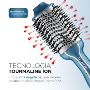 CERÂMICA + TOURMALINE ÍON: Tecnologia para cuidar da saúde dos seus cabelos! A escova tem revestimento em cerâmica e com Tourmaline, mineral que emite íons negativos ao ser ativado pelo calor. Os íons fecham as cutículas dos fios, deixando-os mais macios, brilhantes e sem frizz.