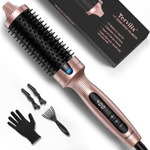 A escova térmica Terviiix de 3,8 cm é uma ferramenta versátil para criar cachos soltos e raízes volumosas, além de alcançar um estilo volumoso dos anos 90 e cabelos em camadas com volume. Esta escova de cachos aquecida possui um barril de cerâmica de turmalina que reduz a estática, doma o frizz e melhora a saúde e o brilho do cabelo. Enriquecido com óleo de argan, queratina e turmalina, libera íons negativos para minimizar os danos causados pelo calor e frizz, fornecendo calor consistente e vedação na umidade. Com um design ergonômico, incluindo uma cerdas de nylon antiqueimaduras e uma cabeça de escova redonda para distribuição uniforme de calor, esta escova é adequada para alisar, enrolar ou pentear. O visor LCD personalizável oferece configurações de temperatura de 160 °C a 204 °C, com recursos de segurança como desligamento automático de 60 minutos, cabo giratório de 360° e suporte de voltagem dupla para conveniência em viagens. Fácil de usar com cerdas que não embaraçam, esta escova é um item essencial para alcançar cabelos elegantes e saudáveis - Resultados profissionais: crie raízes volumosas, cachos soltos e um estilo volumoso dos anos 90 com o pincel de cachos aquecido Terviiix de 3,8 cm. Seu barril de cerâmica de turmalina reduz a estática, doma o frizz e melhora a saúde e o brilho do seu cabelo, além de fornecer versatilidade para alcançar cabelos em camadas com volume. (não é um secador de cabelo) - Redução de danos e frizz: enriquecido com óleo de argan, queratina e turmalina, este pincel libera íons negativos para minimizar os danos causados pelo calor e frizz, fornecendo calor consistente ao cabelo e selando a umidade para cabelos elegantes e saudáveis. - Design ergonômico: um design de cabeça de escova redonda com um barril revestido de cerâmica de turmalina garante uma distribuição uniforme de calor, enquanto a alça ergonômica e as cerdas de nylon anti-queimaduras facilitam a obtenção de cachos naturais. Pode ser utilizado para alisar, enrolar ou simplesmente como um pente comum. - Fácil de usar: o pente frio e os dentes largos e as cerdas que não embaraçam facilitam a aderência e a passagem suave pelo cabelo, evitando emaranhados e oferecendo maior conveniência ao modelar seu cabelo. - Configurações personalizáveis: o visor digital LCD oferece uma variedade de configurações de temperatura de 160 °C a 204 °C para atender a vários tipos de cabelo. Inclui um recurso de desligamento automático de 60 minutos para segurança, um cabo giratório de 360° para facilidade de uso e suporte de tensão dupla (100-240V) para conveniência de viagem.
