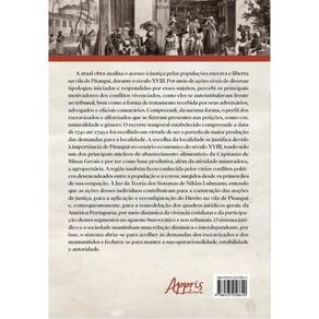 A atual obra analisa o acesso à justiça pelas populações escrava e liberta na vila de Pitan-gui, durante o século XVIII. Por meio de ações cíveis de diversas tipologias iniciadas e respondidas por esses sujeitos, percebi os principais motivadores dos conflitos vivencia-dos, como eles se autointitulavam frente ao tribunal, bem como a forma de tratamento recebida por seus adversários, advogados e oficiais camarários. Compreendi, da mesma forma, o perfil dos escravizados e alforriados que se fizeram presentes nas petições, co-mo cor, naturalidade e gênero. O recorte temporal estabelecido compreende a data de 1740 até 1799 e foi escolhido em virtude de ser o período de maior produção das de-mandas para a localidade. A escolha da localidade se justifica devido à importância de Pitangui no cenário econômico do século XVIII, tendo sido um dos principais núcleos de abastecimento alimentício da Capitania de Minas Gerais e por ter como base produti-va, além da atividade mineradora, a agropecuária. A região também ficou conhecida pelos vários conflitos políticos desencadeados entre a população e a coroa, surgidos desde os primórdios de sua ocupação. À luz da Teoria dos Sistemas de Niklas Luhmann, entendo que as ações desses indivíduos contribuíram para a construção das noções de justiça, para a aplicação e reconfiguração do Direito na vila de Pitangui e, consequente-mente, para a remodelação dos quadros jurídicos gerais da América Portuguesa, por meio dinâmica da vivência cotidiana e da participação destes segmentos no aparato bu-rocrático e nos tribunais. O sistema jurídico e a sociedade mantinham uma relação dinâ-mica e interdependente, por isso, o sistema abria-se para acolher às demandas dos escra-vizados e dos manumitidos e fechava-se para manter a sua operacionalidade, estabilida-de e autoridade.