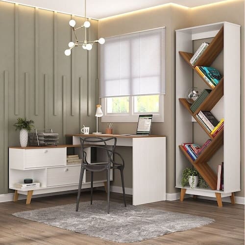 O Escritório Completo Desk é a solução ideal para quem busca funcionalidade e estilo. Inclui uma escrivaninha em L com 2 portas basculantes, acabamento em MDP 15mm com Finish Foil e 4 prateleiras, perfeita para organizar seu espaço. A estante para livros, com 6 prateleiras e o mesmo acabamento moderno, complementa o ambiente. Ambos os móveis são fáceis de montar e ideais para um escritório elegante e bem organizado. Acabamento: Finish Foil Altura do Conjunto: 199 cm Ambiente: null Ambiente Principal: Escritório Cor: Branco/Nogal Cor do Produto: Branco/Nogal Informação Complementar: 1x Mesa para Escritório Escrivaninha em L Retrô 136x120cm Branco/Nogal Largura: 136 cm Altura: 75,5 cm Peso: 37 kg Profundidade: 45 cm Necessita Montagem: Sim