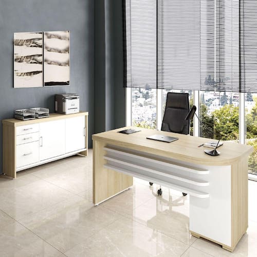 O(a) Escritório Completo Tamburato 2 Portas 7 Gavetas Carvalho/Branco - Artany Móveis é produzido em MDP e Tamburato na escala de brilho Fosco, e possui um grau de dificuldade de montagem: Médio.