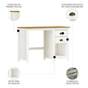 Os puxadores metálicos no tom ouro envelhecido agregam um toque refinado Escrivaninha Para Quarto, valorizando ainda mais o visual da peça. O nicho aberto amplia a praticidade, sendo ótimo para livros ou itens decorativos.