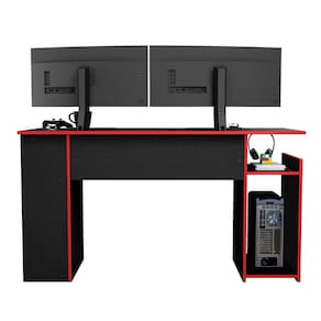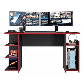 Tampo de 25mm, comporta até 2 monitores, design gamer, nicho para o gabinete, suporte metálico para headset, 2 prateleiras decorativas.