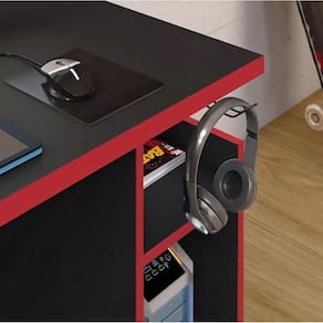 confortável e otimizada. Conta com Tampo de 25mm fornecendo grande estabilidade, possuí nicho para acomodar o seu gabinete da melhor forma, 3 prateleiras para acoplar suas decorações, espaço para até dois monitores, facilitando assistir uma boa live enquanto joga, além de possuir também suporte metálico para o seu headset facilitando a organização desse item essencial. A também conta com passa-fios.