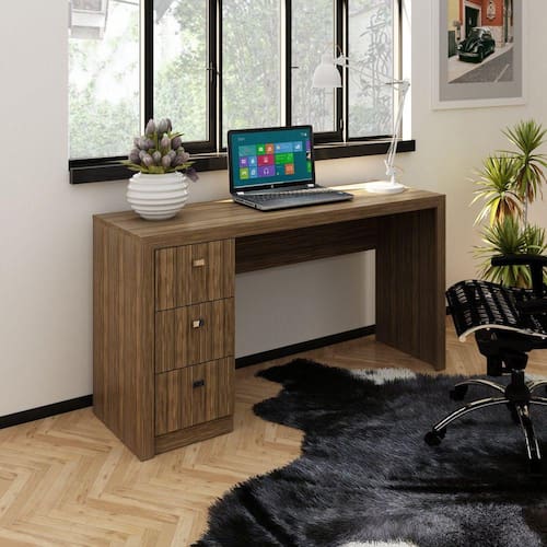 A Escrivaninha Tecno Mobili é feita em MDP com forte estrutura, que garante estabilidade ao produto. A Mesa para Escritório Tecno Mobili possui altura de 74,5cm e largura de 1,36m, com profundidade 46,5cm, medidas que oferecem comodidade e ergonomia na hora de estudar ou trabalhar. O conjunto para escritório Tecno Mobili é ideal para compor a decoração de escritórios, home offices e até quartos, pois suas 3 gavetas com corrediças metálicas e puxadores cromados oferecem boa capacidade de organização. A Escrivaninha Tecno Mobili é um produto com alto padrão de qualidade e durabilidade, como você procura. Acabamento da Gaveta: Finish Foil Acompanha Manual de Instalação: Sim Ambiente: Escritório Complexidade da Montagem: Média: pode ser montado por mais de uma pessoa e/ou necessite de maior conhecimento para montagem Escala de Brilho: Semi-Fosco Escala de Brilho da Gaveta: Semi-Fosco Formato: Retangular Gaveta com Chave: Não Itens Inclusos: 1 Escrivaninha, manual de montagem e kit ferragem. Material da Gaveta: MDP Material do Puxador da Gaveta: PVC Material Principal: MDP Necessita Montagem: Sim Peso: 29,6 kg Peso Máximo por Gaveta: 3 kg Possui Passa Cabos: Não Possui Pés: Não Possui Porta Objetos: Não Possui Portas: Não Possui Prateleiras: Não Possui Suporte para Teclado: Não Recomendações de Uso, Manutenção e Limpeza: Utilize um pano levemente umedecido com água, seguido de um pano seco. Sapatas Niveladoras: Sim Sistema de Montagem: Parafuso e minifix Suporta Até (kg): 15 kg Tipo de Corrediça da Gaveta: Metálica Simples Tipo de Puxador da Gaveta: Externo